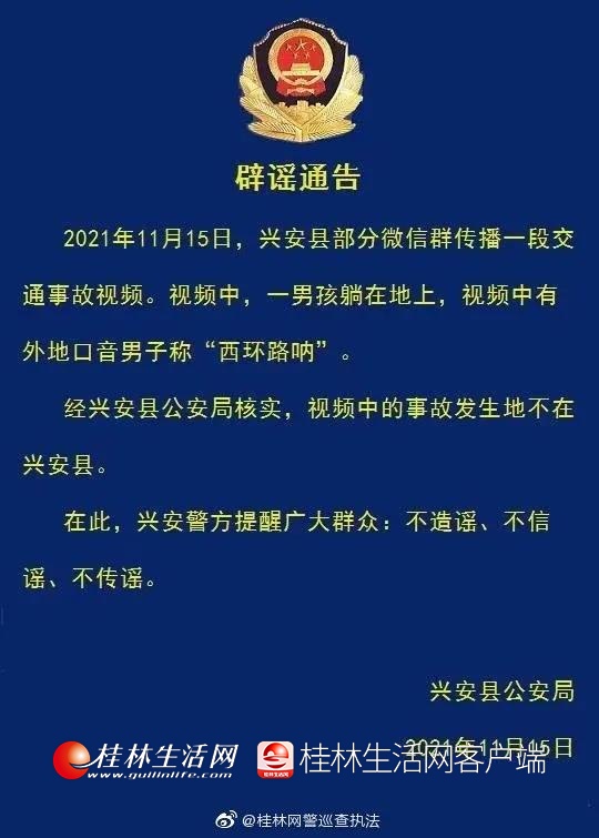 针对此事,兴安县公安局发布了辟谣通告:经兴安县公安局核实,视频中的事故发生地不在兴安县。