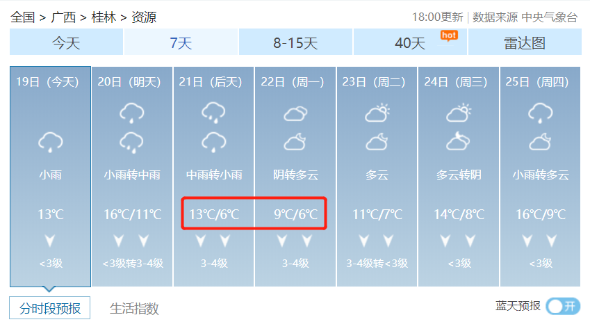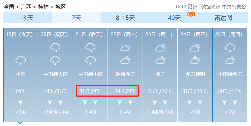 ▼桂林气象台19日16时发布:今晚到明天小雨,局部中雨,气温16到18度,北风1到2级。后天中到大雨,局部暴雨;大后天小雨转阴。