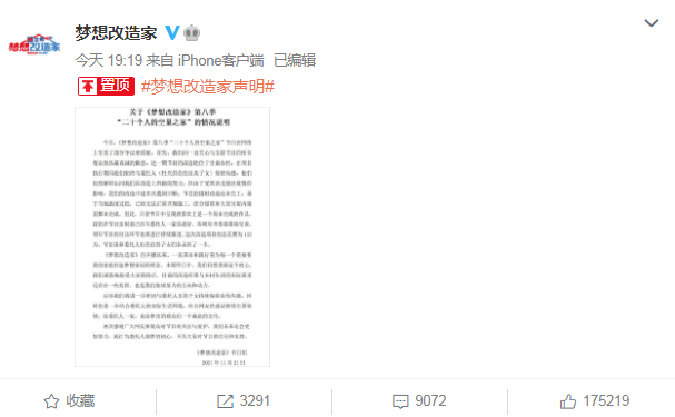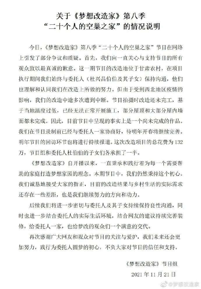 11月21日晚,《梦想改造家》节目组发布了针对这期节目的官方说明