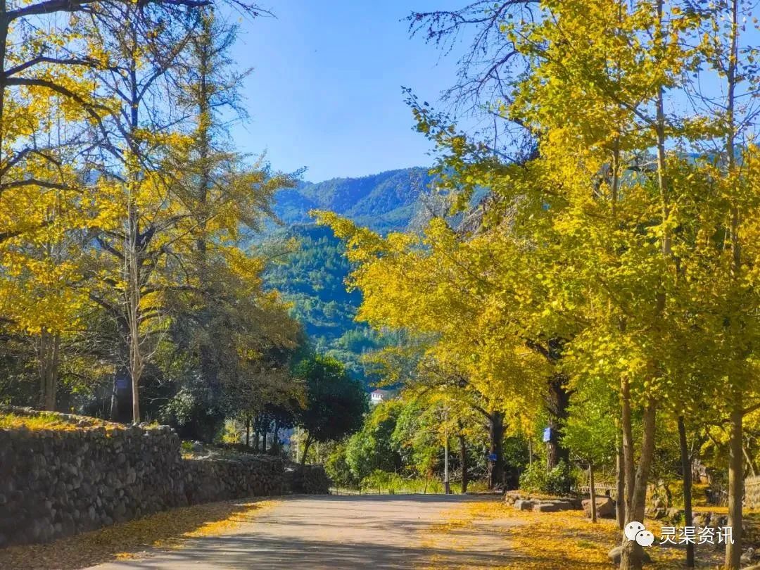 树身犹如披上一层“黄金甲”挂满树梢的片片银杏叶犹如金色的风铃在风中摇曳生姿妆点乡村美景成为扫“黄”的一道靓丽风景