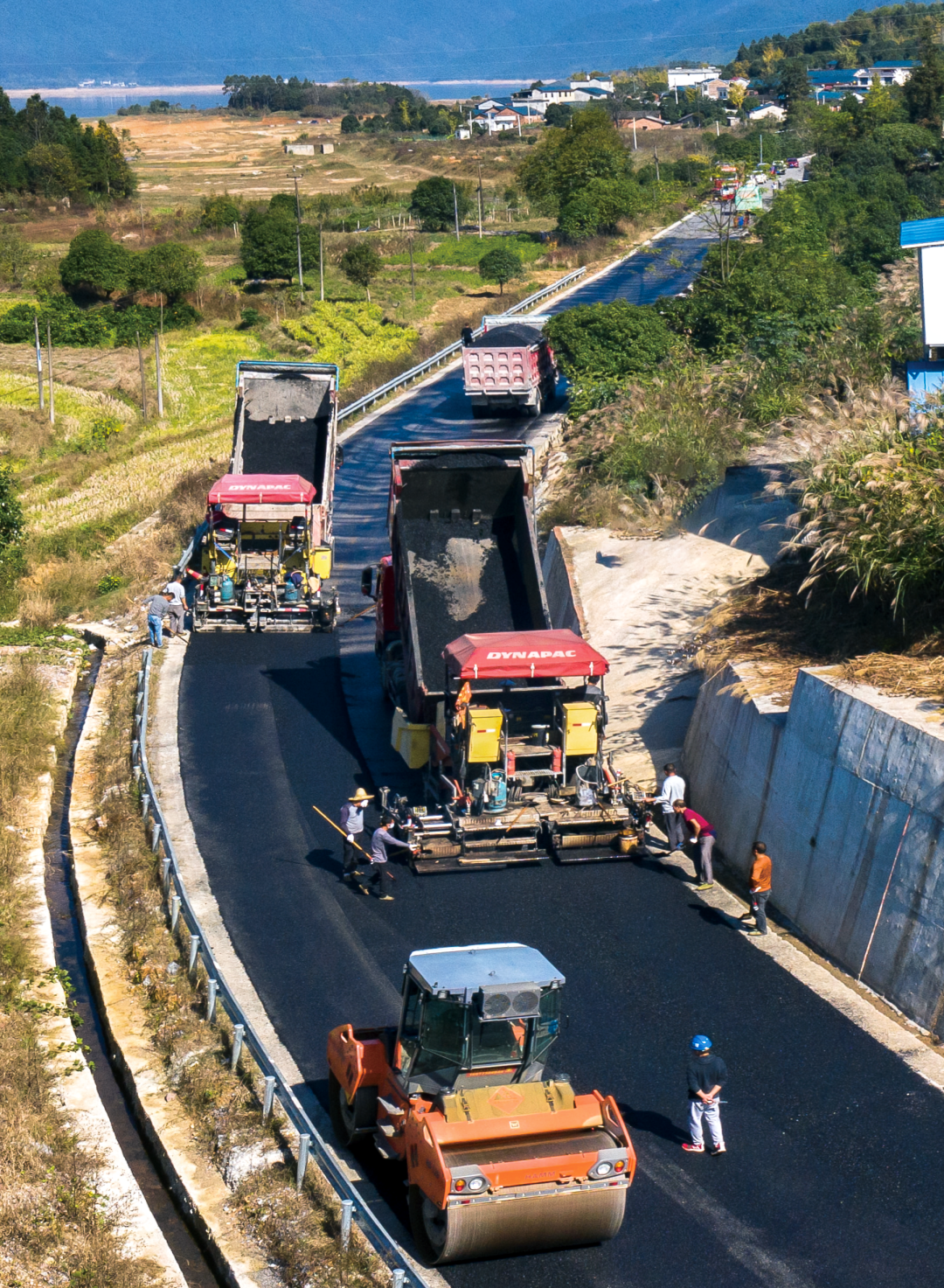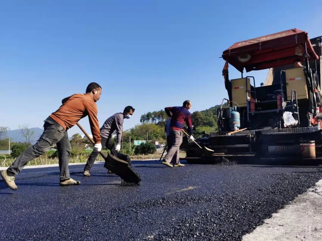 施工人员铺设沥青路面这个项目的建设可有效提高灵川县境内路网等级,改善灵川县乡镇的交通状况,不仅对区域旅游经济开发具有重要的推动作用,也能促进扶贫开发,进一步服务“三农”、促进社会主义新农村建设及沿线、周边的经济发展。