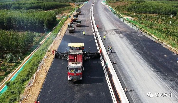 贺巴高速象州北枢纽互通工人们正在进行沥青摊铺。