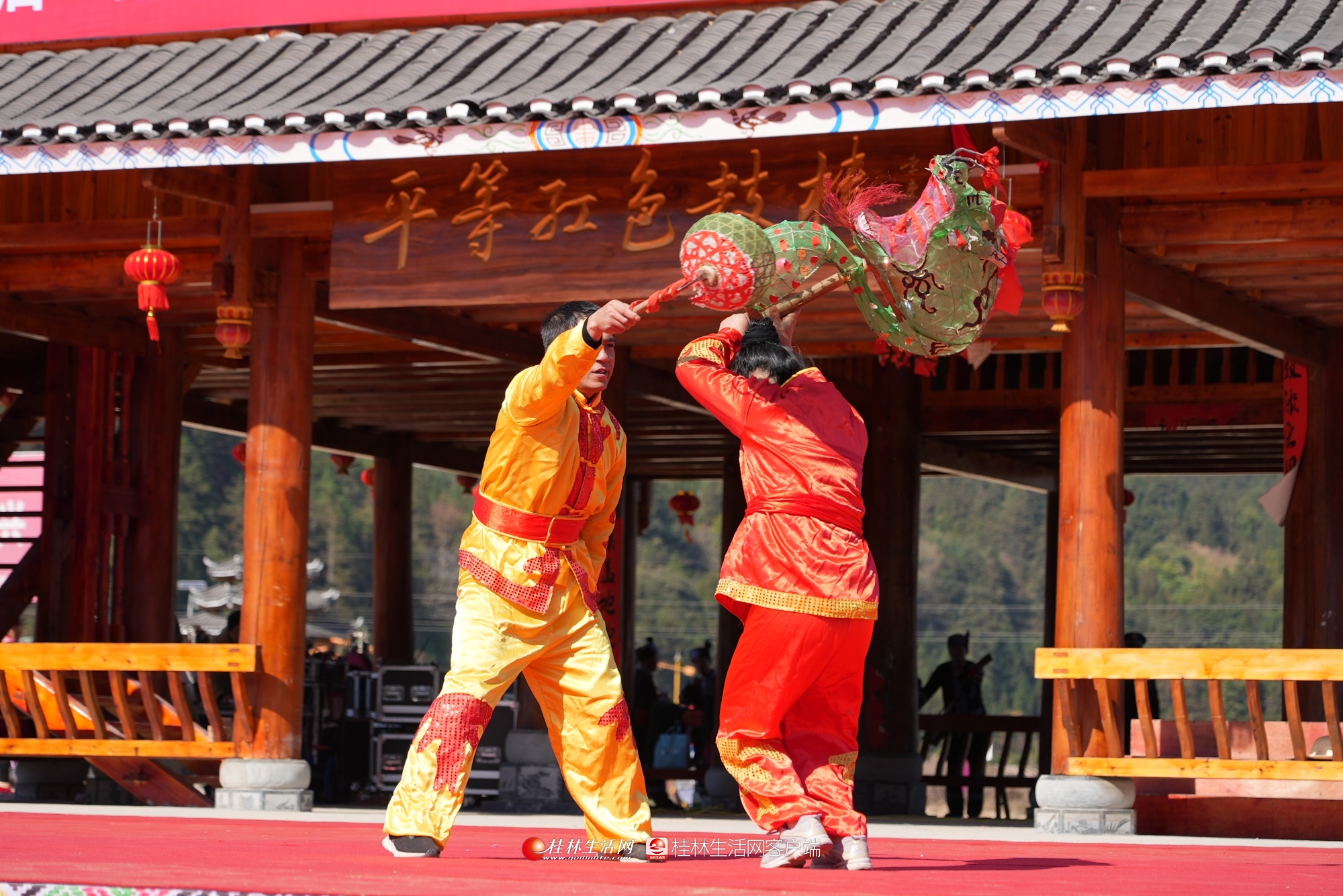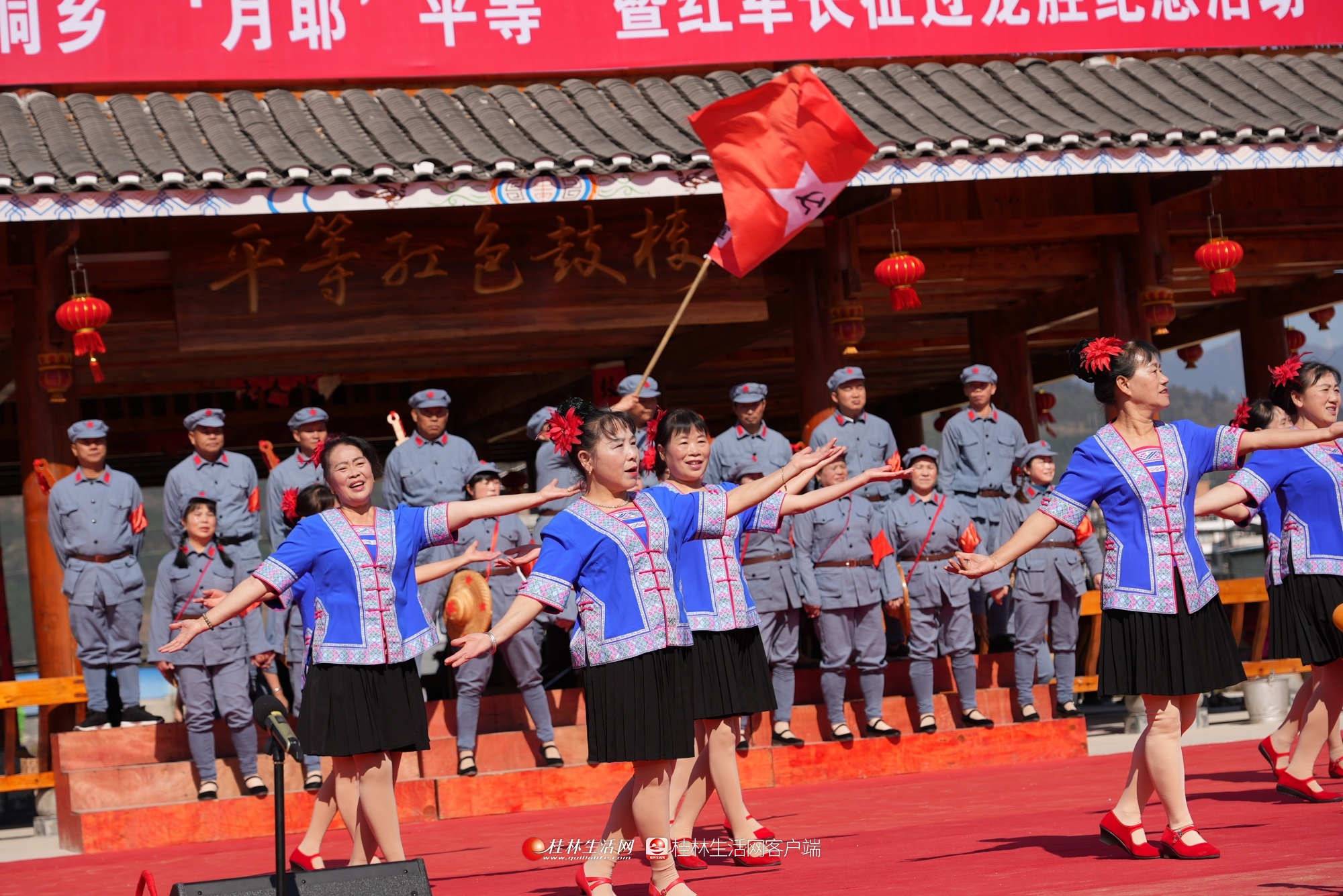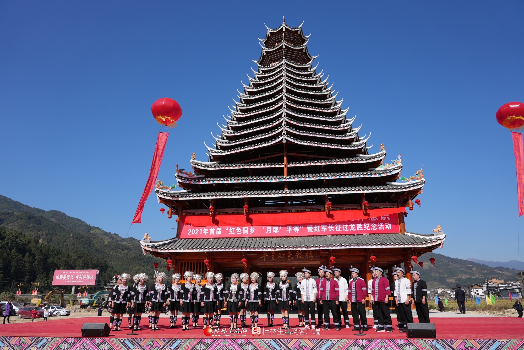 当天上午,四方宾客欢聚一堂,一起“月耶”,纪念红军长征过龙胜,庆祝平等红色鼓楼落成,共同欢度侗年。当地侗族同胞自编自演的《芦笙踩堂》《我为红军打草鞋》《匏颈龙舞》《民族文化我传承》《琵琶声声感党恩》《多耶》等传统侗族节目,将本次活动推向高潮,共同展现了侗族文化的无穷魅力。