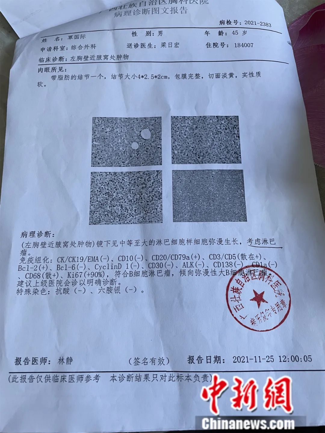 但命运却没有放过这个一直以来默默行善的人。覃国际先后辗转来宾市人民医院、广西胸科医院检查、治疗,通过手术切除肿块。经病理诊断,覃国际不幸被诊断为B细胞淋巴瘤。