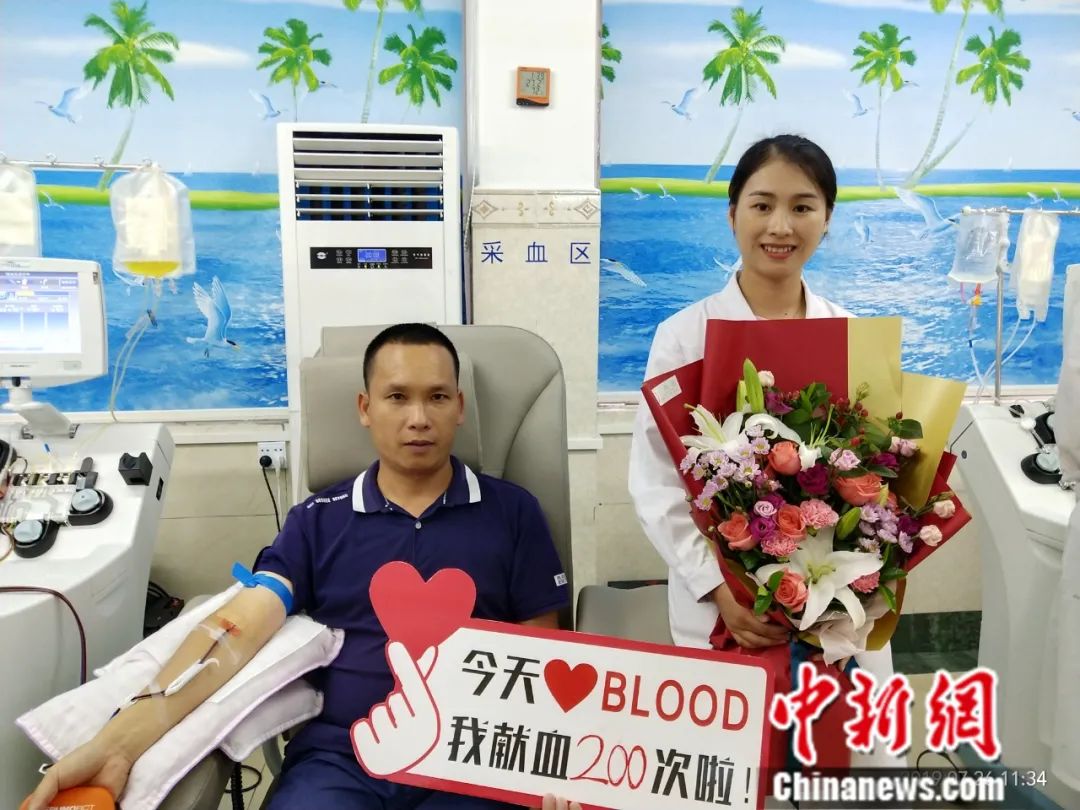 15年来,“献血狂人”覃国际走遍全国50多个城市,献出超过全身血液量17倍左右的血液。