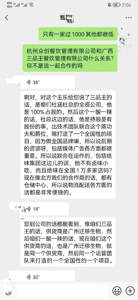 甄某给丛先生发来不少资料,包括“三×王”PPT资料、加盟要求等。甑某称,“某酸某辣”牛肉粉投资小、收益高。