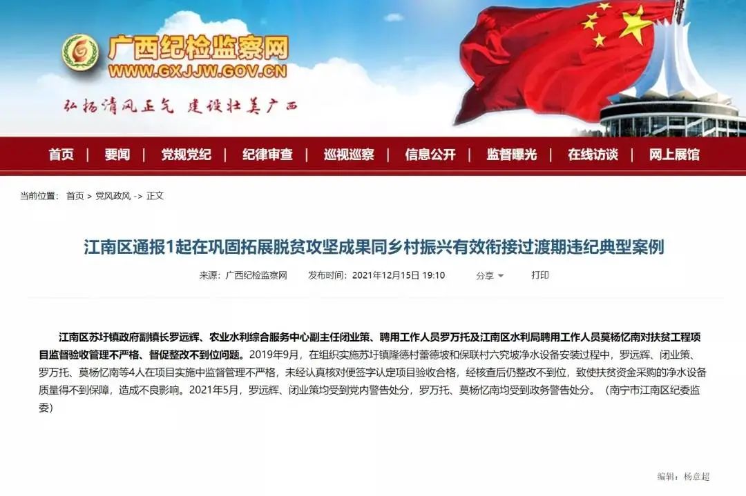 江南区苏圩镇政府副镇长罗远辉、农业水利综合服务中心副主任闭业策、聘用工作人员罗万托及江南区水利局聘用工作人员莫杨忆南对扶贫工程项目监督验收管理不严格、督促整改不到位问题。2019年9月,在组织实施苏圩镇隆德村蕾德坡和保联村六究坡净水设备安装过程中,罗远辉、闭业策、罗万托、莫杨忆南等4人在项目实施中监督管理不严格,未经认真核对便签字认定项目验收合格,经核查后仍整改不到位,致使扶贫资金采购的净水设备质量得不到保障,造成不良影响。2021年5月,罗远辉、闭业策均受到党内警告处分,罗万托、莫杨忆南均受到政务警告处分。