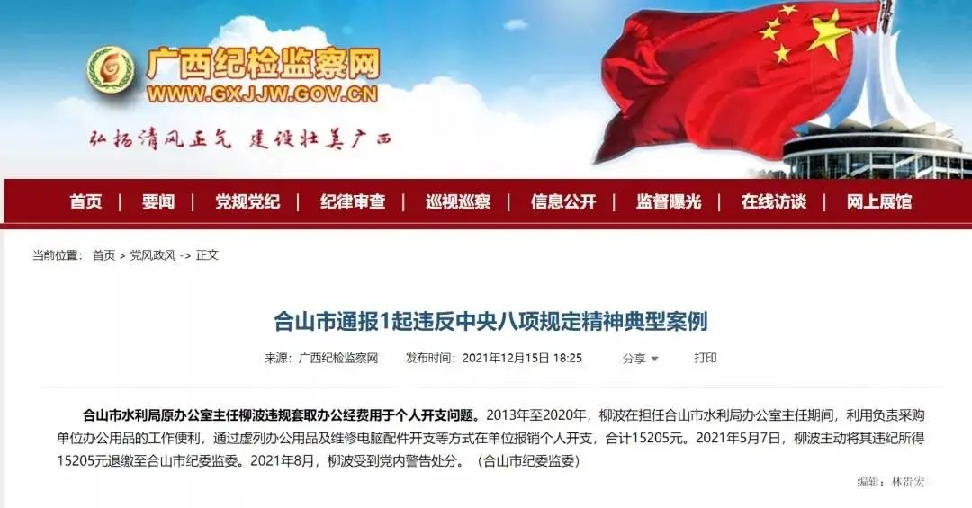 合山市水利局原办公室主任柳波违规套取办公经费用于个人开支问题。2013年至2020年,柳波在担任合山市水利局办公室主任期间,利用负责采购单位办公用品的工作便利,通过虚列办公用品及维修电脑配件开支等方式在单位报销个人开支,合计15205元。2021年5月7日,柳波主动将其违纪所得15205元退缴至合山市纪委监委。2021年8月,柳波受到党内警告处分。