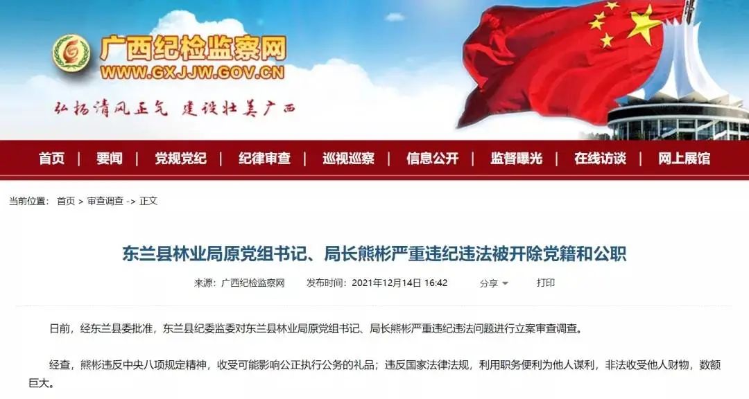 东兰县林业局原党组书记、局长熊彬严重违纪违法被开除党籍和公职