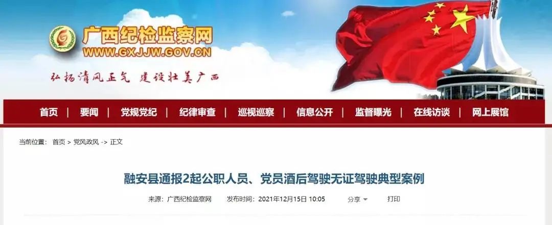 融安县通报2起公职人员、党员酒后驾驶无证驾驶典型案例