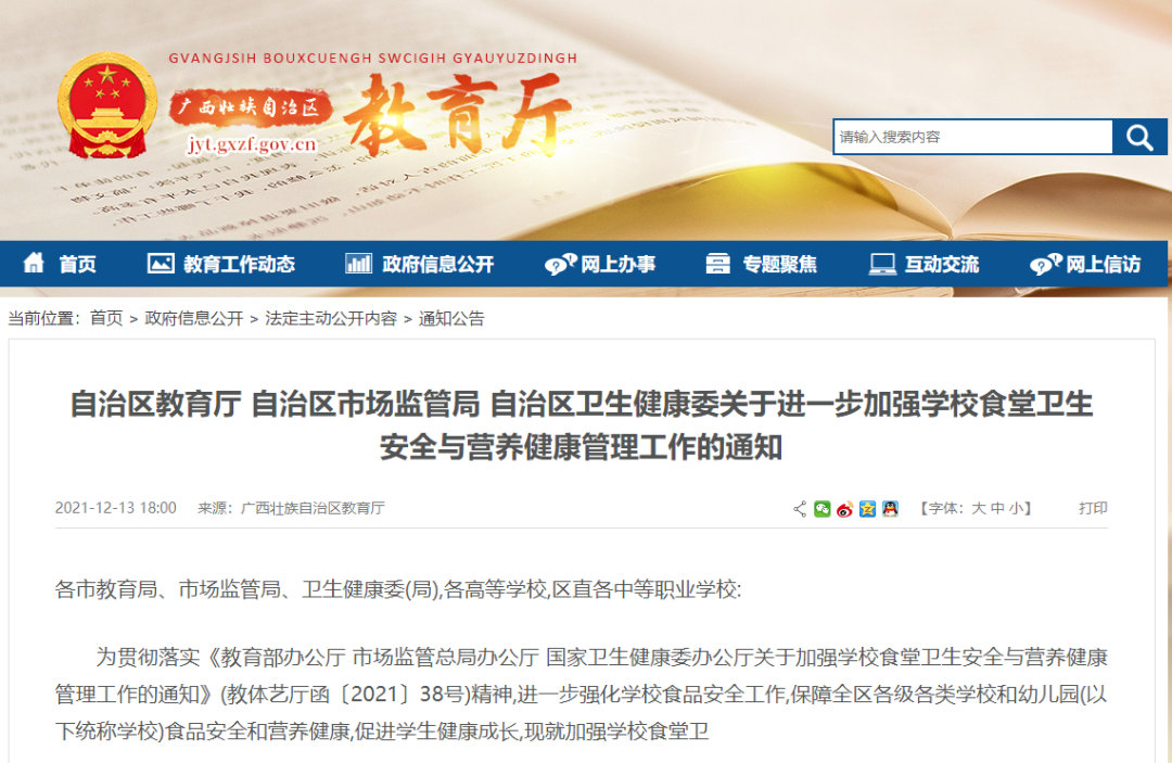 近日,自治区教育厅、自治区市场监管局、自治区卫生健康委联合发通知,要求进一步加强学校食堂卫生安全与营养健康管理工作,明确中小学校和幼儿园不得制售冷荤类、生食类、裱花蛋糕以及四季豆等高风险食品,鼓励推行小份菜、半份菜、套餐等措施,遏制餐饮浪费。
