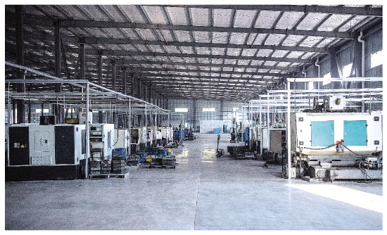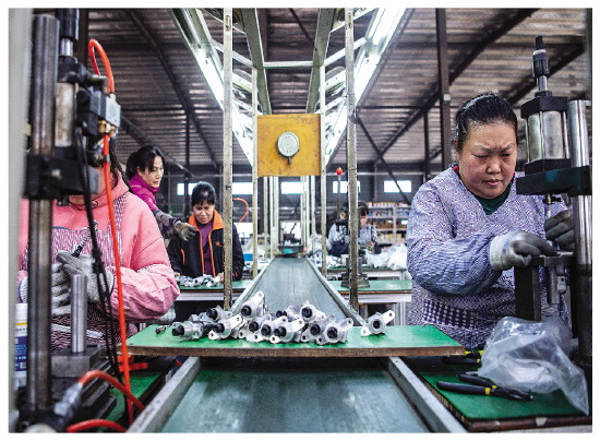工人们在厂房内进行汽车配件加工。