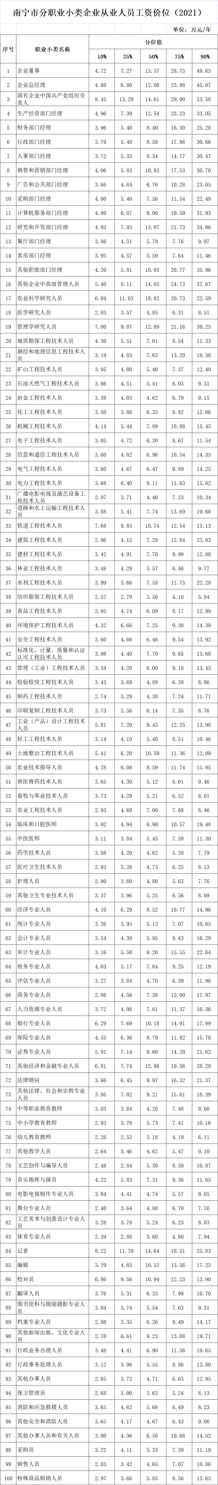 ▲滑动查看:南宁市分职业小类企业从业人员工资价位(2021)。