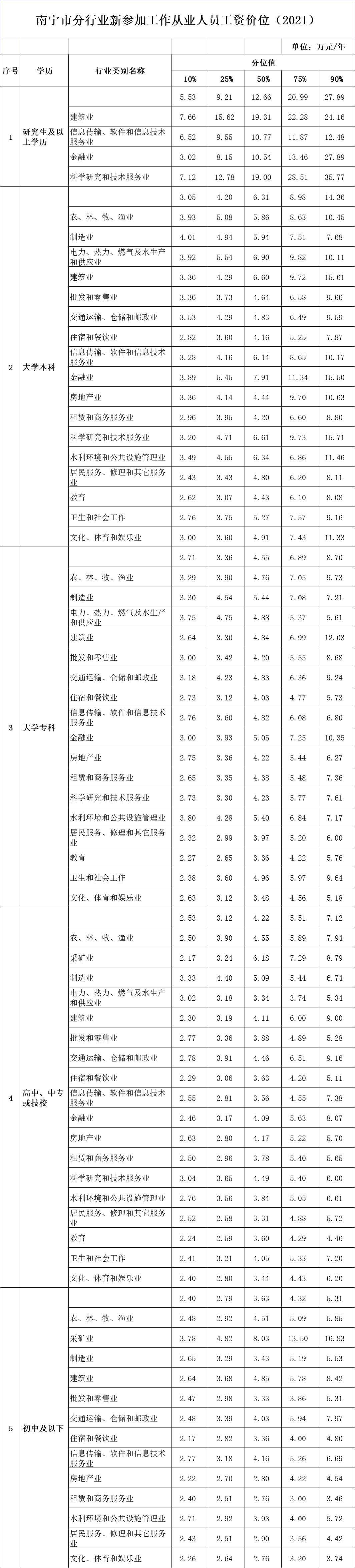 南宁市分行业新参加工作从业人员工资价位(2021)。