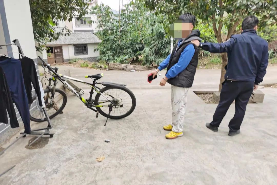 永福镇派出所民警丁佑林:确认一名嫌疑人的身份之后,我们派出所民警立即出警,去到嫌疑人的家里,对他进行抓捕。在成功抓捕的同时,也在他家里发现了一辆被盗的自行车,据这名嫌疑人的供述,还有另外两名一起和他偷自行车,后来督促这两名嫌疑人到我们派出所到案。