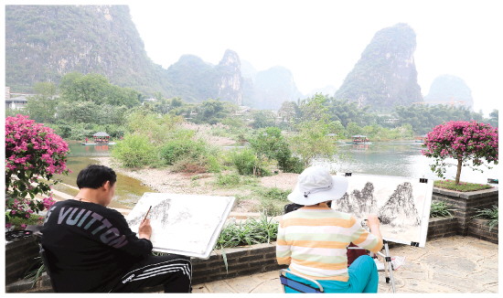 遇龙河边的鸡窝渡村风景美丽,吸引游客前来写生。