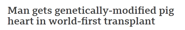 就在半个月后,美国马里兰大学又为异种移植带来了一个巨大的好消息:一名57岁的男子在接受转基因猪心脏移植手术3天后情况良好。