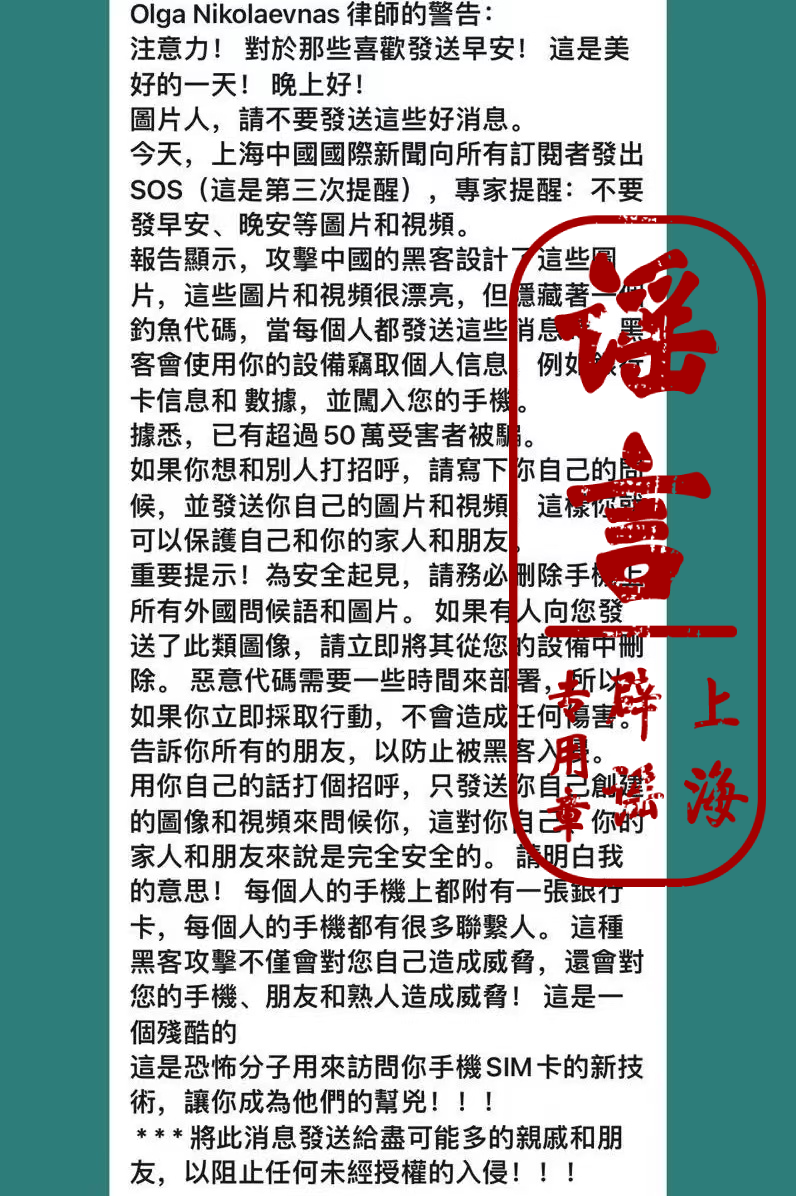 而“转发图片手机会中毒、个人信息会被窃取”信息内所称的发布方“上海中国国际新闻”根本就是子虚乌有。事实上,并没有这一新闻机构,也没有其他新闻机构发布过类似消息。