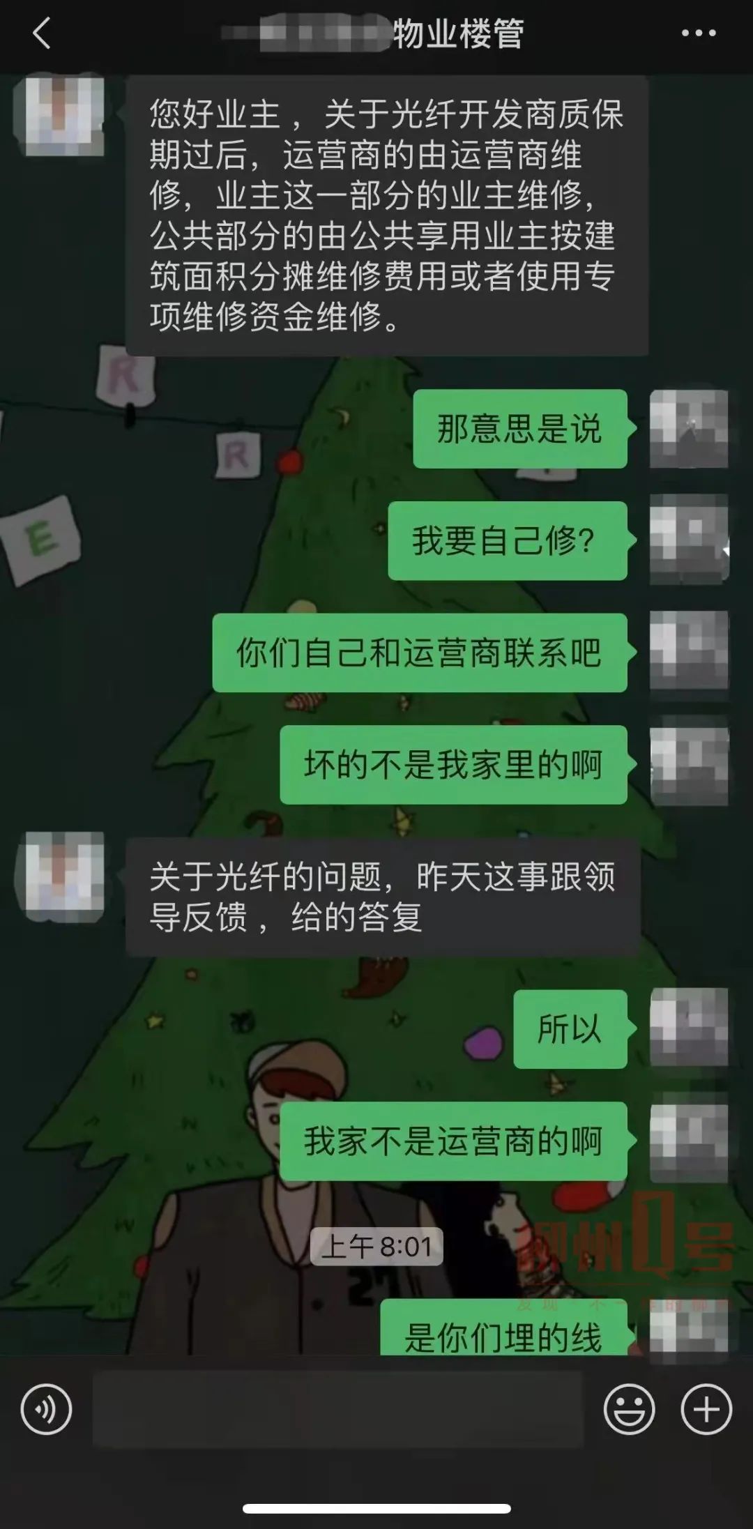 易女士向记者出示了几张她与小区物业楼栋管家的聊天截图,物业答复易女士:线缆超过质保期后,运营商部分由运营商维修,业主部分由业主维修,公共部分则使用房屋公共维修基金维修。