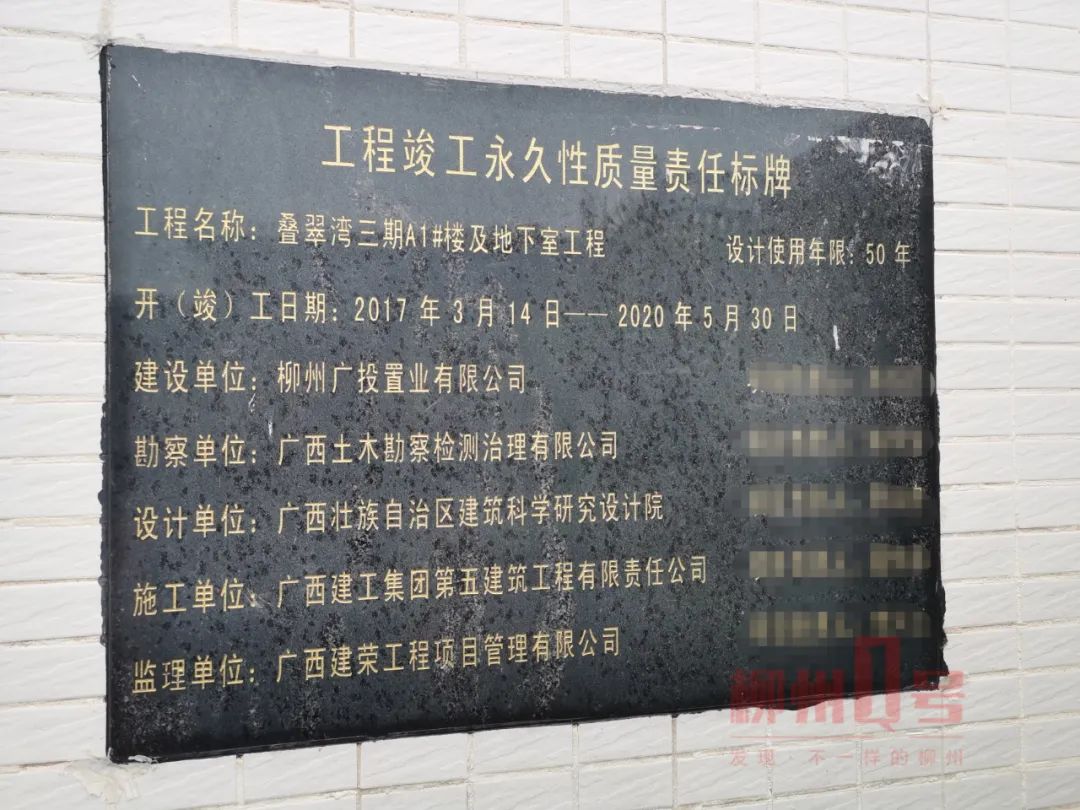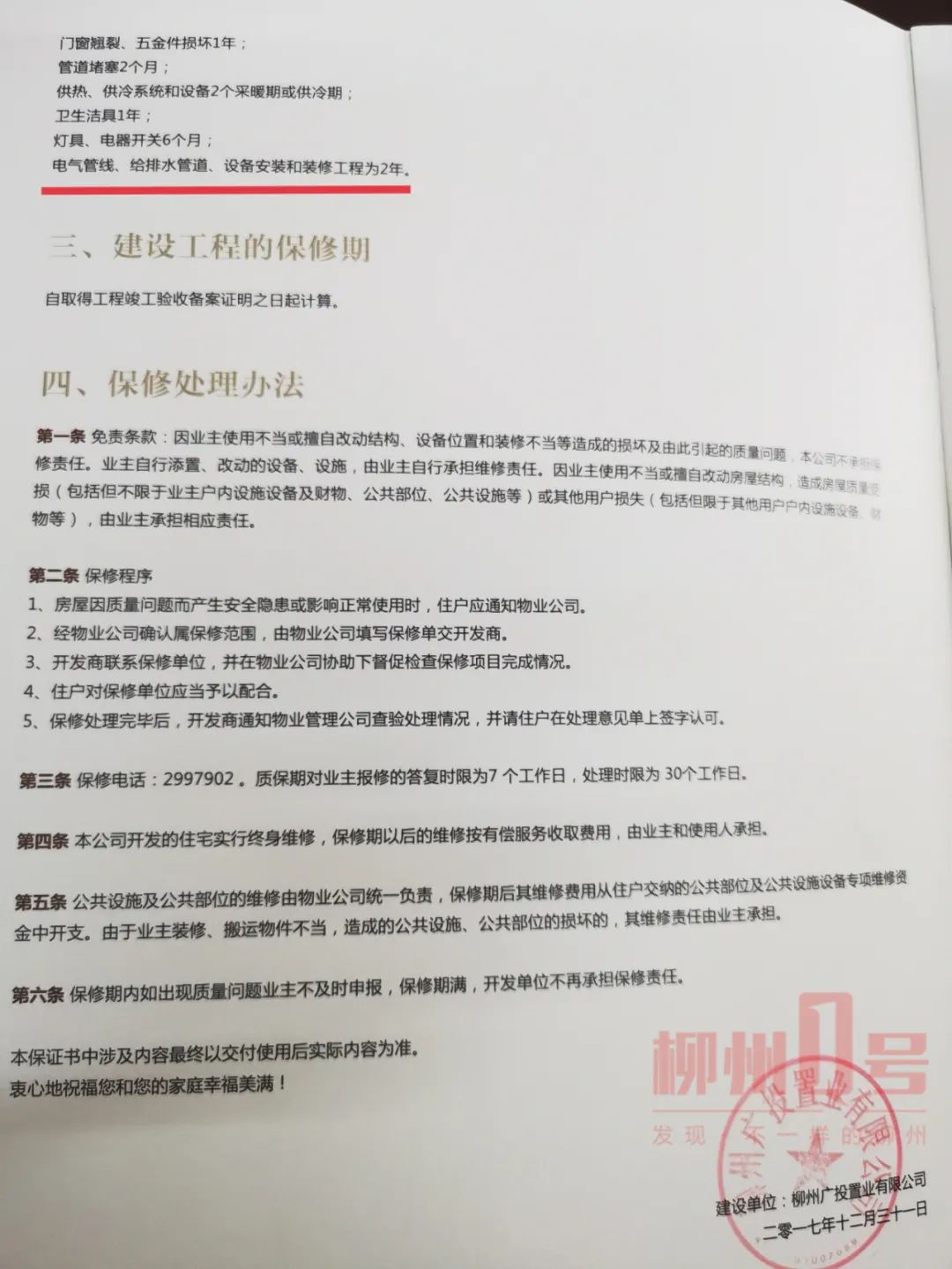 在物业提供的一份资料中,记者注意到其中内容同样有此条款。此外,记者还了解到,易女士所在的1#楼,竣工日期为2020年5月30日(到现在未满两年),建设单位为柳州广投置业有限公司。