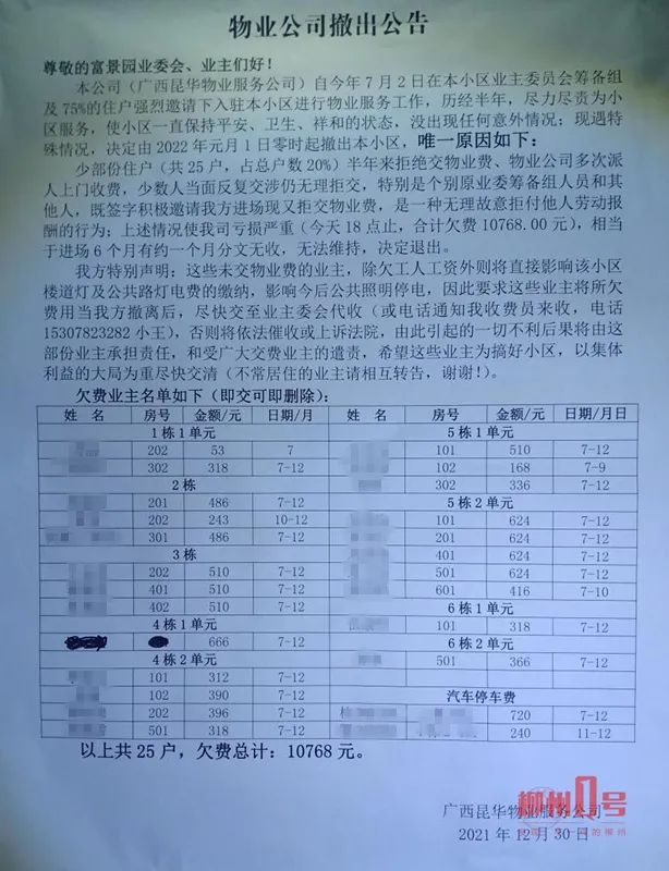 2月12日,记者来到鱼峰区富景园小区见到了吴女士,据她介绍,昆华物业于2021年7月10日进入该小区进行管理。“业主陆陆续续把当年12月份公共设施的电费交给物业,可今年1月份小区还是被停电了。”吴女士说,“物业收完电费后,就在当年12月28日贴出公告要撤场,3天后就离开小区了。”对于物业的行为,吴女士感到生气。