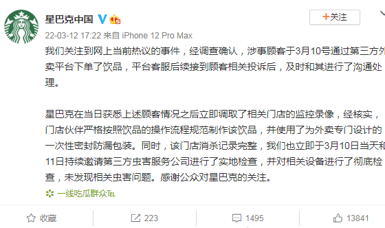 声明还称,星巴克在当日获悉上述顾客情况之后立即调取了相关门店的监控录像,经核实,门店伙伴严格按照饮品的操作流程规范制作该饮品,并使用了为外卖专门设计的一次性密封防漏包装。同时,该门店消杀记录完整,我们也立即于3月10日当天和11日持续邀请第三方虫害服务公司进行了实地检查,并对相关设备进行了彻底检查,未发现相关虫害问题。