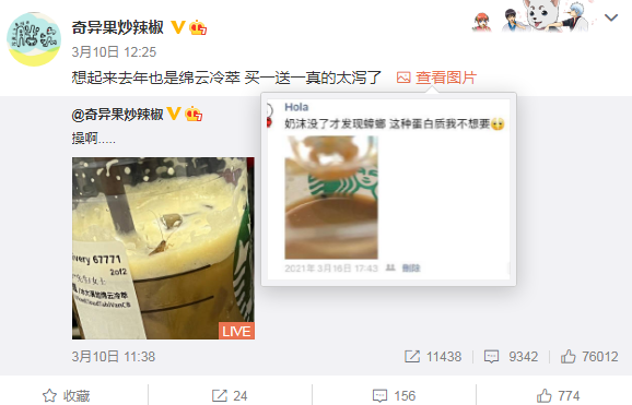 根据博主@奇异果炒辣椒 3月10日发布的微博,图片显示一只活蟑螂在杯中摇动着触角。该博主表示去年也曾发生过一次,随后晒出另外一张图,引发大量网友关注。