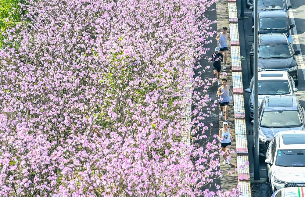 ▲在柳州西堤路,跑步爱好者从紫荆花下穿过。