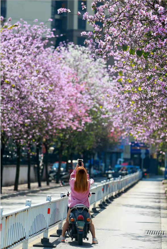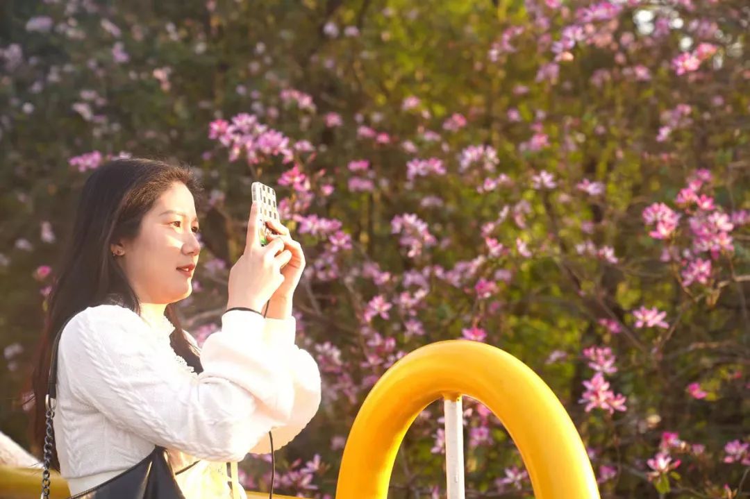 水南路作为柳州人赏花的“网红路”,吸引了一批批前来赏花打卡的市民群众,大家纷纷用手机、相机、无人机,定格这撩人春色。