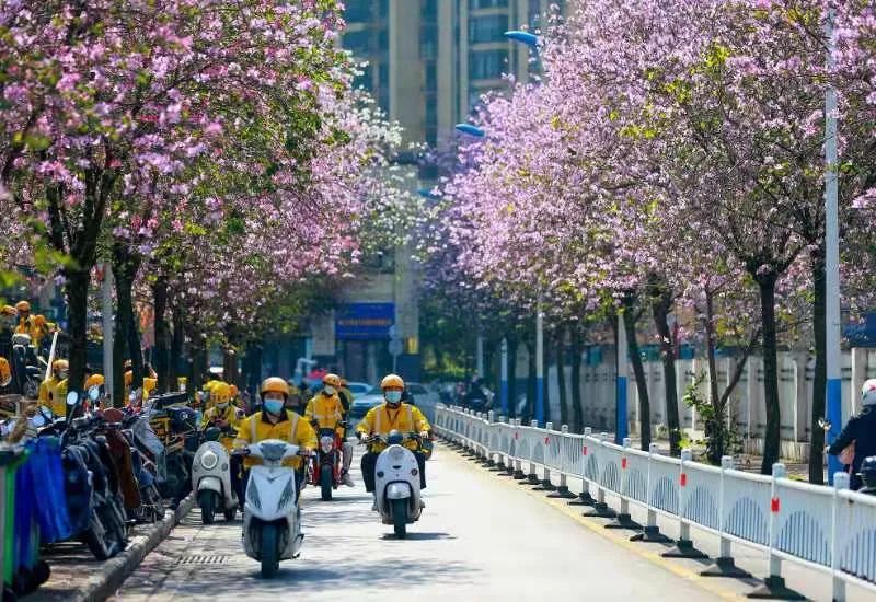 ▲柳州柳邕路上,电动自行车在紫荆花下穿行。