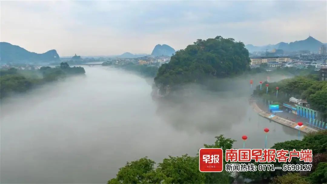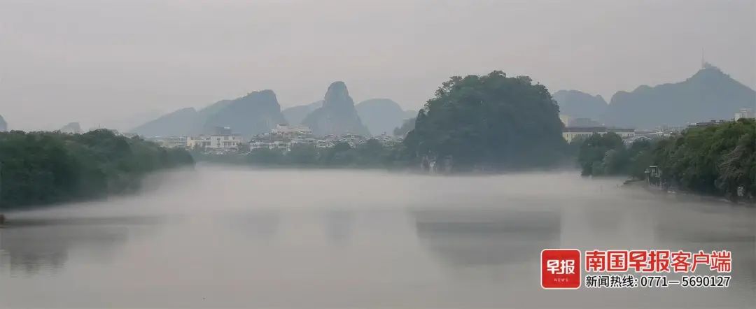 ▲漓江上伏龙洲云雾缭绕。李腾钊摄