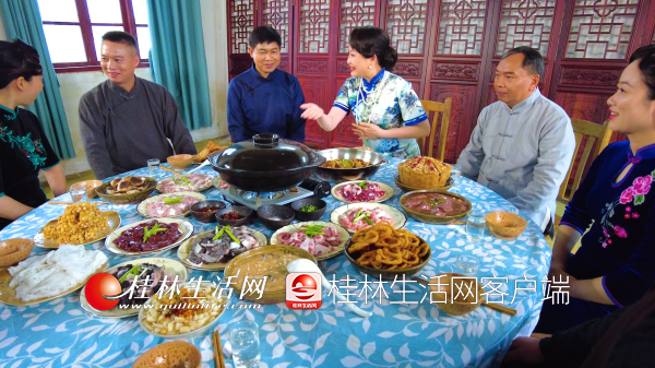 1937年卢沟桥事变后,抗战烽火弥漫,为培养人才,李宗仁将军和郭德洁夫人指令广西教育厅任命广西著名教育家唐现之筹办广西省立桂林师范学校。学校举行落成典礼时,李宗仁和郭德洁莅临校园,亲自动手栽下两棵罗汉松,祝福学校像松柏一样四季常青。主持人在介绍学校时,偶遇在省立师范里面正在举行一场沉浸体验式的短剧拍摄:由临桂区人大常委会副主任唐正红扮演的文学戏剧大师田汉先生正在全神贯注、循循善诱地教学生们唱《义勇军进行曲》,学生们童声稚嫩,但唱得激情澎湃,鼓舞人心。学堂里的这群孩童们身着民国学生装,时而在门庭间诵读诗书,时而三五成群嬉笑打闹,追逐奔跑,一张张天真烂漫的脸蛋为校园平添了许多生机活力......镜头转到另一侧,临桂区委副书记谢静扮演的郭德洁女士正在宴请当地文人墨客的热闹场景,只见郭女士一身旗袍娉婷婀娜,端庄大方、体态轻盈、素雅玲珑,正兴趣盎然地向宴会人员介绍桌上的菜肴佳品,以米粉酒为中心,四周错落有致地摆放着各种色味俱佳的两江美食:鲜香麻辣的抛鸭、酥脆清甜的松花糖、甜而不腻的松糕、金黄亮泽的油炸粑粑、黄白相间的甜酒汤圆、滑嫩可口的牛血、夹心粉甜的马蹄糕等等,随便一样都让人垂涎欲滴、味蕾彻底绽放。大家志趣相投,欢聚一堂,一边吃着菜品,一边就儿童的教育问题各抒己见,在觥筹交错间吟诗作赋,在诗月飞花中相谈甚欢。那么,这些美食是怎么做出来的呢?让我们跟随镜头一起走到后厨,去实地探索两江美食的奥秘吧。