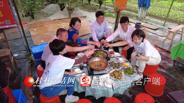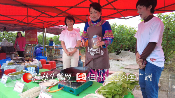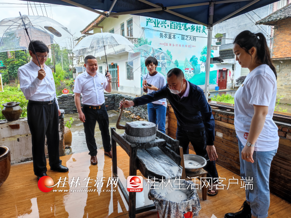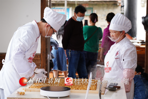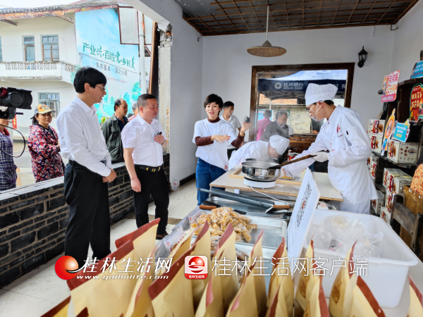 主持人跟着临桂区法院院长曹光华和临桂区两江镇党委书记李庆旺的步伐,来到了菜园村两江米粉酒馆,酒馆略显朴素陈旧,却颇有格调,走近前看,师傅正在有条不紊地制作米粉酒,专注的神情加上熟练的操作,吸引不少人驻足围观、拍手叫绝,更是即兴发挥创作祝酒彩调,将现场气氛推上了个小高潮。桌面上排列整齐的便是荣获央视宣传推广的民间小吃松花糖,在两江镇流传着这样一句话:“粒粒金黄如松花,老人小孩吃不怕”。柜子上还摆放着在当地小有名气的两江干米粉,常有桂林市其他县区的游客慕其名而来。