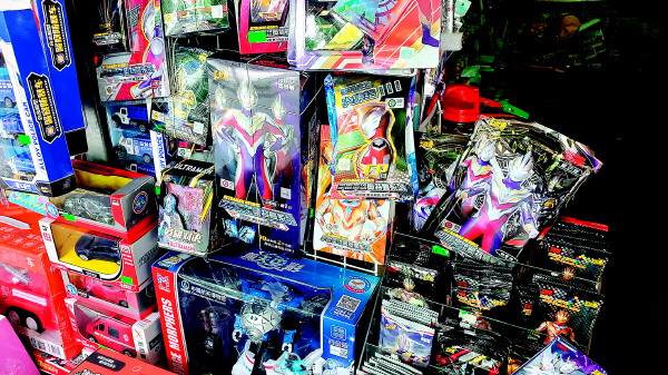 秀峰区某小学门口一店铺内醒目的奥特曼“专柜”。