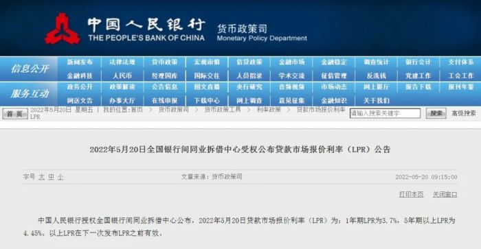 LPR迎来“降息”。5月20日,中国人民银行授权全国银行间同业拆借中心公布,最新一期贷款市场报价利率(LPR)为:1年期LPR为3.7%,5年期以上LPR为4.45%。