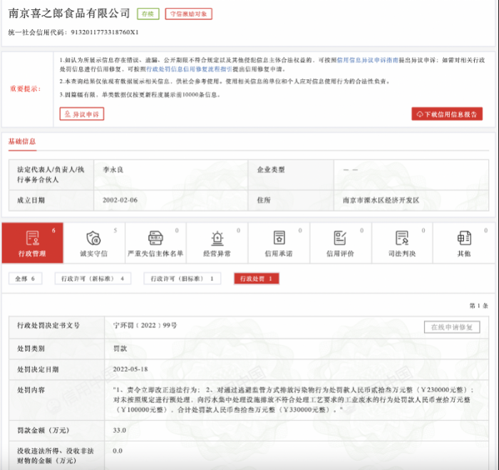 相关行政处罚书显示,江苏南京喜之郎食品有限公司污水总排口正在排水时,废水采样监控处于关闭状态,无法正常对正在排放的废水进行监测。经过现场检测,排放的废水不符合标准。南京市生态环境局对该公司逃避监管、违法排污,合计处罚33万元。