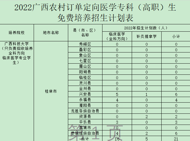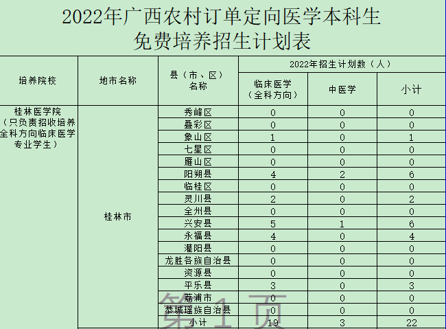 培养院校及县(市、区)名额计划详见《2022年广西农村订单定向医学本科生免费培养招生计划表》(附件1)。