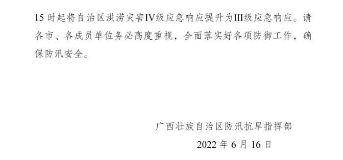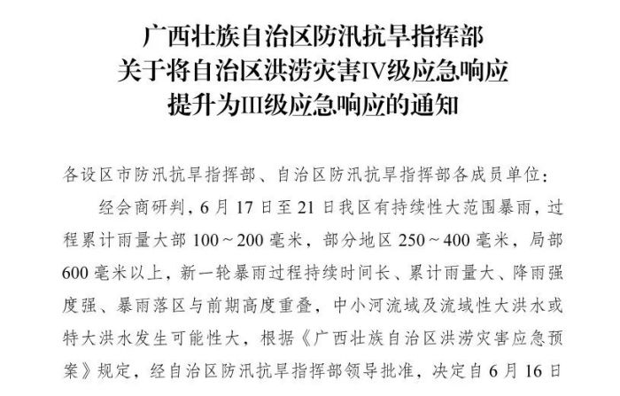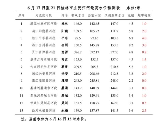 6月17日至21日,桂江、湘江、洛清江、古宜河、资江五大河流将出现流域性大洪水;其中湘江干流可能出现20年一遇左右洪水;洛清江可能出现10~20年一遇洪水;桂江平乐河段可能出现10~20年一遇洪水,漓江桂林至阳朔河段可能出现5~10年一遇洪水;古宜河及资江干流可能出现超警洪水。各主要江河涨幅为2~8米,超警幅度为0~4米。