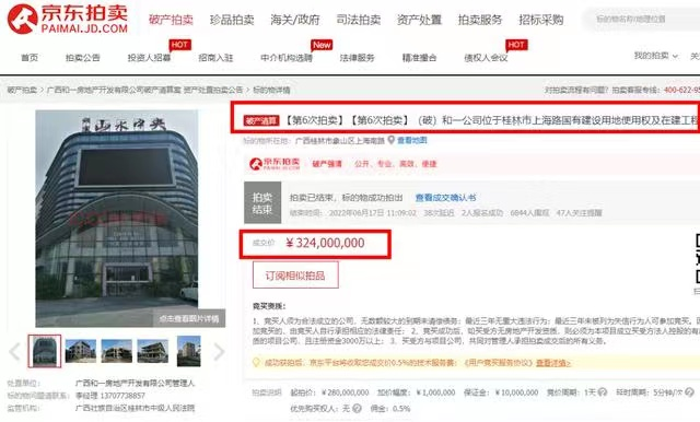 6月17日,烂尾了近五年的兴宸·山水中央第六次拍卖在京东拍卖平台举行。与前五次拍卖均无人报名不同的是,这次有两家企业报名参加竞拍。两家竞拍人经过44轮,近一个半小时的竞价,最终润实(广州)置业有限公司以3.24亿元的价格成功竞得。