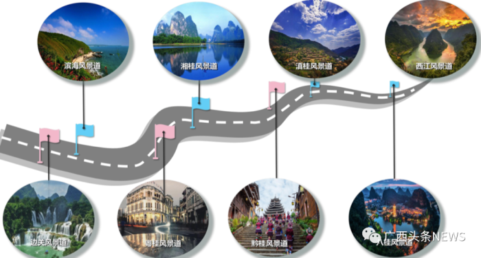 进一步将分散的单个景区串成广西大旅游环线,最终打造成世界级旅游风景道品牌。 特色鲜明的8条国家旅游风景道