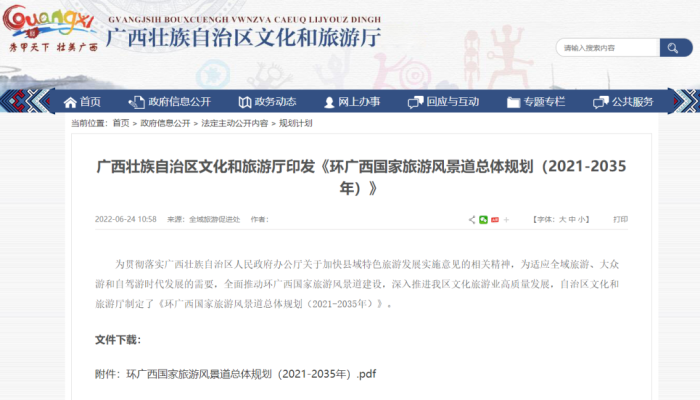 记者从广西文化和旅游厅了解到,近日该厅编制印发《环广西国家旅游风景道总体规划》(以下简称《规划》)。根据《规划》,广西将构建集“食、住、行、游、购、娱”于一体的风景道旅游体系,形成环绕全区、东西南北贯通、带动沿边地区,与周边省份路网多点灵活互通的环广西国家旅游风景道大环线。