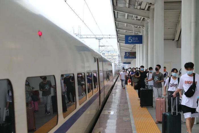 6月29日15时20分,来自桂林电子科技大学、桂林理工大学等高校的630多名学生,乘坐桂林开往玉林的D9683次动车组列车返回家乡,这是今年暑期国铁南宁局开行的首趟“学生专列”。