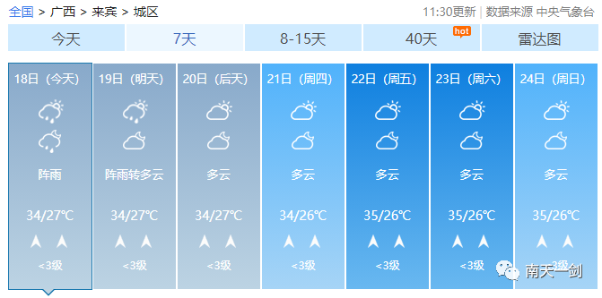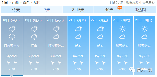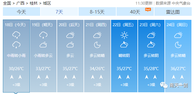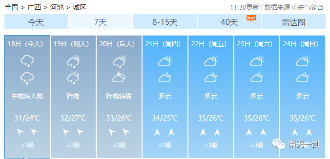 今天(18日)上午,桂北出现明显降雨。气温方面(11时)有了雨水的加入,桂北部分地区在30℃以下,尤其是河池一带只有23℃左右,而其余大部气温为30~33℃,天气依旧炎热。