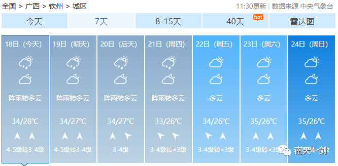 21日,桂西和沿海部分地区有阵雨或雷雨、局地大雨到暴雨,我区其它地区多云到晴。桂东、桂北部分地区最高气温35~37℃、局地38℃以上。2.海洋天气预报北部湾海面:今晚到明天,多云到晴有分散阵雨或雷雨,偏南风5级,阵风6级;20-21日,多云有阵雨或雷雨,东南风5级,阵风6级。请海上船只注意。