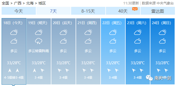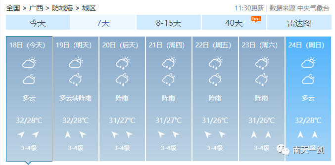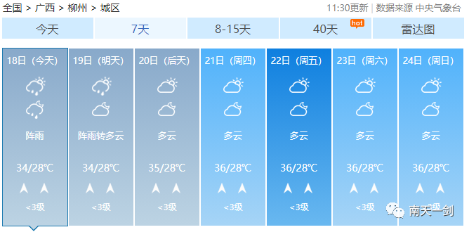 1.暴雨蓝色预警今天晚上和明天白天,河池、柳州、百色、桂林等市的部分地区有大雨、局地暴雨到大暴雨并伴有短时雷暴大风等强对流天气,我区其它地区多云大部有阵雨或雷雨、局地大雨。桂南部分地区最高气温35~37℃,局地38℃以上。