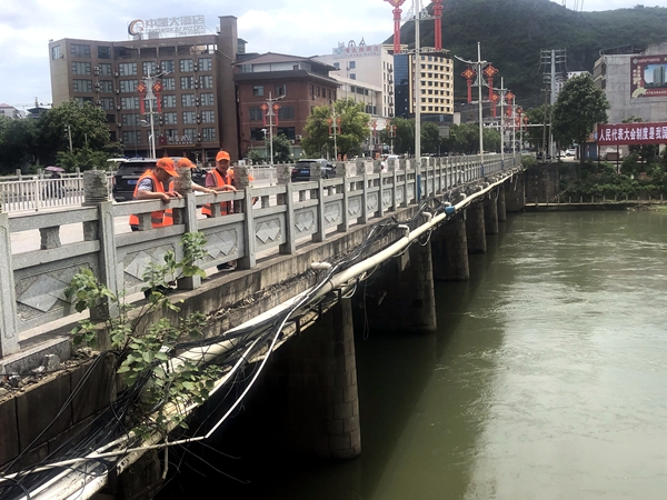 全州县公路养护中心工作人员对大桥上的管线做最终确认