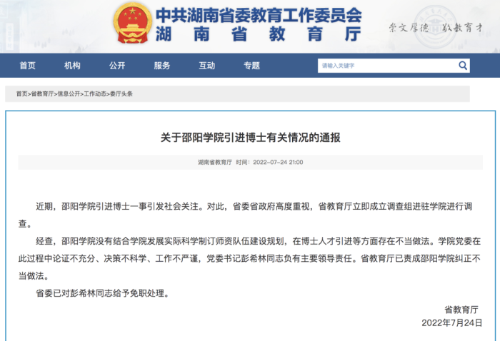 7月24日,湖南省教育厅发布《关于邵阳学院引进博士有关情况的通报》。