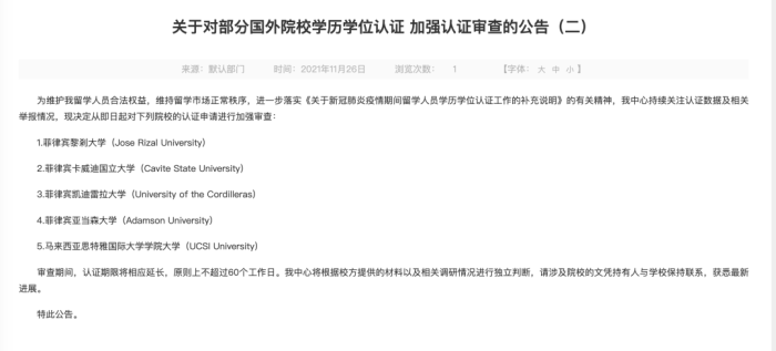 值得一提的是,教育部留学服务中心2021年11月26日发布的公告显示,中心持续关注认证数据及相关举报情况,现决定从即日起对部分院校的认证申请进行加强审查,而上述23名博士毕业的菲律宾亚当森大学赫然在列。