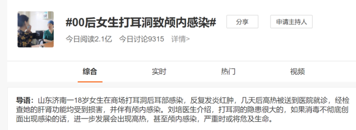 女生在商场打耳洞后耳部感染几天后高热被送到医院就诊经检查她的肝肾功能均受到损害并伴有颅内感染……