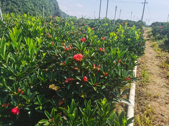 45岁的梁海秀是广西永福县百寿镇朝兑村人,2019年回乡创业,投资近100万元,到百寿镇江岩村租赁50亩土地,自打井3个,建起一片四季常开的四季杜鹃红山茶花海。